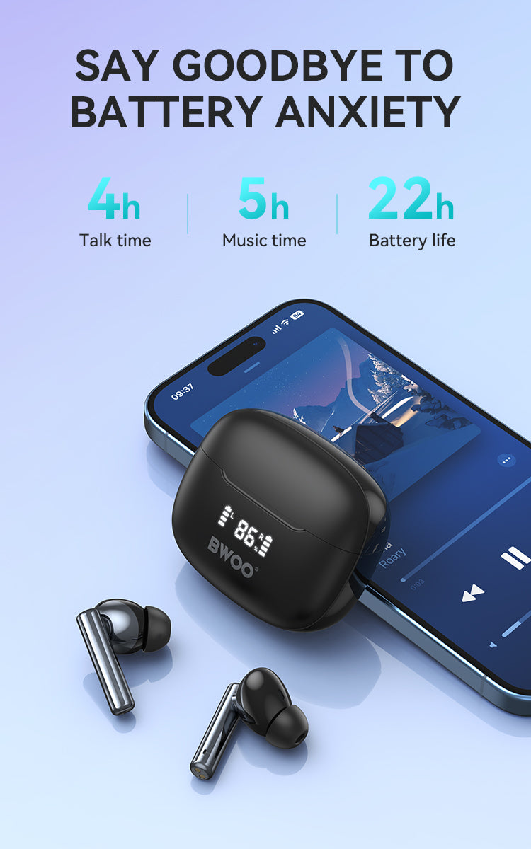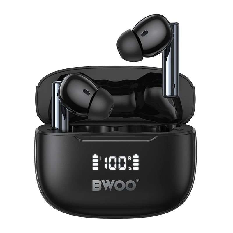 30-Hour Long Endurance Battery: BWOO ANC wireless earbuds with power digital display feature a large LED power display in the charging case, allowing you to check the earbuds and the charging case battery status at a glance. Coupled with a marvelous battery combination, it keeps you away from battery anxiety. With a 40 mAh battery in each earbud, it delivers 5 hours of non-stop music time to light up your inner drive and drive away the afternoon blue every afternoon. And 400 mAh battery in the charging case provides 5 charging cycles for the earbuds for an additional 25 hours of entertainment time. ANC Extreme Active Noise Cancellation: BWOO TWS earbuds with ANC use self-adaptive noise cancellation with the latest ANC active noise canceling system, which can automatically adapt to your ears and surroundings to cancel 95% of ambient noise and deliver a noise-canceling depth of up to -42 dB. Whether you are in an airport, noisy streets, or subway, it can mute the world in a second to provide you with an immersive experience for gaming, music, or calling. BT5.3 Advanced Connectivity Technology: These TWS earbuds adopt the BT5.3 advanced connectivity technology that provides 3 times faster transfer rate and superior anti-interference performance to deliver high-efficiency connection with low power consumption. Pairing with the latest low-latency technology, it will not cause annoying sound delays and desync of audio and video, promising a smooth sound experience while gaming, music, or live streaming. Added the Hall switch, these TWS ANC noise cancelling earbuds can automatically connect with the targeted device in a radius of 10 meters once the charging case is open. Tailored Comfortable Wear: BWOO TWS noise canceling earbuds are ergonomically designed to comfortably fit your ear canal for zero pressure wear while providing a perfect acoustic fit for enhancing the noise cancellation performance of these earbuds. Meanwhile, with built-in sensitive sensors, it allows for song selection, hands-free calls, music playback, and more simply by a tap on the earbud stem.Hi-res Certified Audio: To promise top-notch sound quality, BWOO, the Chinese leading ANC wireless earbuds supplier implements the most professional acoustic configuration and cutting-edge 3D stereo sound technology on these earbuds to present the ultimate immersive stereo sound. Expertly tuned by an internationally famous sound engineer, it renders a vivid and detailed sound with powerful bass, amazing treble, and clear mids. With these stellar settings, these earbuds are also a high-res certified choice for audiophiles