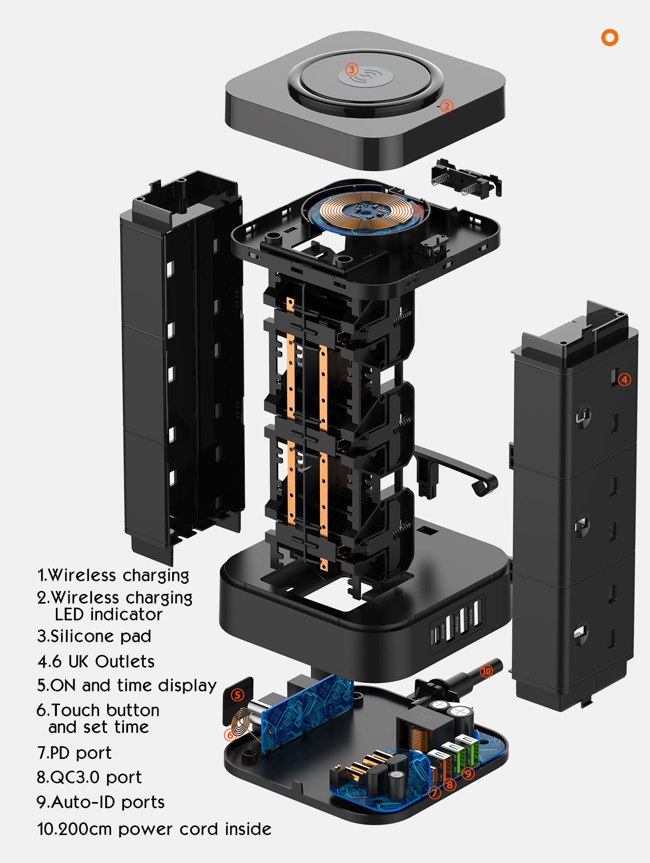 LDNIO 3-in-1 USB-C Power Extension Cord with 15W Wireless Charger and Cable Management Box, 5 Universal Outlets 20W USB-C PP, 2 USB-A QC3.0 18W 2M Cable